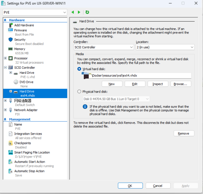具体就是把 Docker\resources\wsl\ext4.vhdx 放到 Hyper-V虚拟机的新建的 scsi硬盘驱动器上